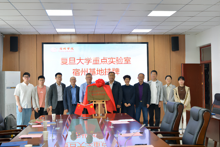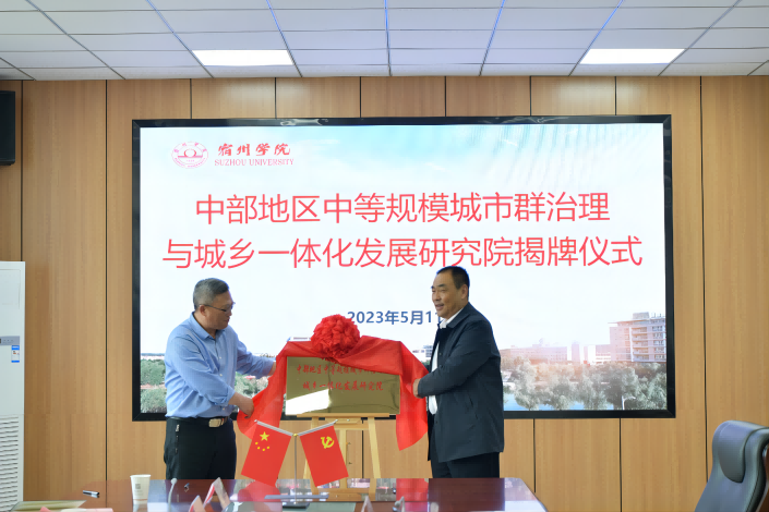 李亮和唐亚林共同为中部地区中等规模城市群治理与城乡一体化发展研究院、复旦大学重点实验室宿州学院研究基地揭牌。(撰稿:张亚锋 审核:杨刚、张雁凌 )