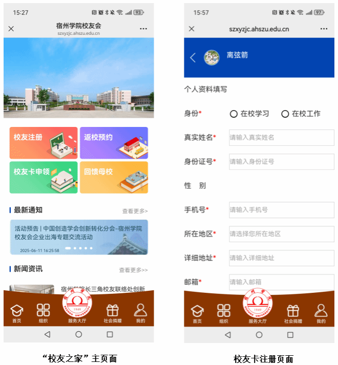 3、校友身份认证之后,点击“校友卡申领”,即可申请到宿州学院校友卡。