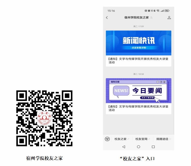1、校友首先需关注“宿州学院校友之家”微信公众号,然后点击“校友之家”端口进入“校友之家”。